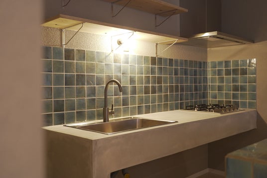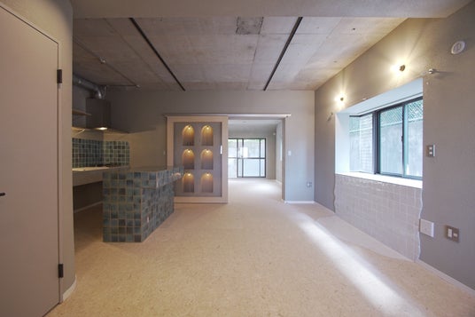 彫刻アーティストである山崎 千里 氏 と 染飾アーティストである皆川 百合 氏が手掛けたクレベール菊名104号室は、タイルや照明一つをとってもこだわり抜いたアートな居住空間を実現しました。キッチンや洗面台に使用されているタイルは海外からの輸入品を用いており、洋室にある曲線を描く床にアクセントとしてデザインされた杭は彫刻家の山崎氏自らが工具を使用し施工しました。仕切りのレースカーテンは染飾家の皆川氏が出身地奈良の茅の生地から作った特別なものです。また、玄関から奥側に向かうにつれ天井を高くするなど空間が広く感じられるようにこだわっています。住居のような、まるでアトリエでもあるかのような独特な空間は、物件をまるでひとつの作品として仕上げた唯一無二のリノベーションとなっています。