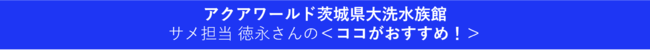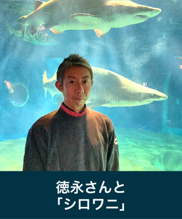 当館を代表するサメ、シロワニは鋭い目つきにむき出しの歯が特徴で迫力満点ですが、実はとても大人しい性格。エサの時間には他のサメたちに遠慮しながら落ちたエサを拾って食べます。
