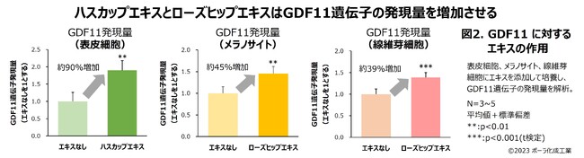 各細胞においてGDF11発現量を増やすことができれば、複数の皮膚老化の予防につながると考えられます。そこで皮膚を構成する細胞3種にさまざまなエキスを添加し、GDF11の発現量を増加させるものを探索した結果、ハスカップエキスおよびローズヒップエキスにその作用を発見しました(図2)。