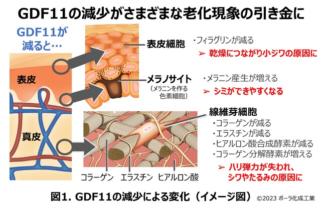 これにより、GDF11が減ることでうるおいを保つ力が弱まると考えられます。なお、乾燥は小ジワの形成などにつながることが分かっています。