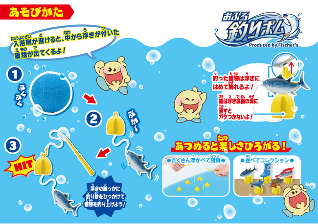 全6種類(ピラニア、サメ、マグロ、長靴、リュウグウノツカイ、シークレット)のマスコットが入った入浴剤を溶かすと、「浮き」がぷかぷかと湯面に浮き、セットで付いてくる釣り竿の針をひっかけて釣り上げることができます。入浴剤が溶けると沈んだマスコットが見えない程度のにごり湯になり、どのマスコットが釣れるのかは、釣り上げるまでのお楽しみとなっています。釣り上げたあとは、浮きをマスコットの台座代わりにして飾ることができ、コレクションする楽しみも!