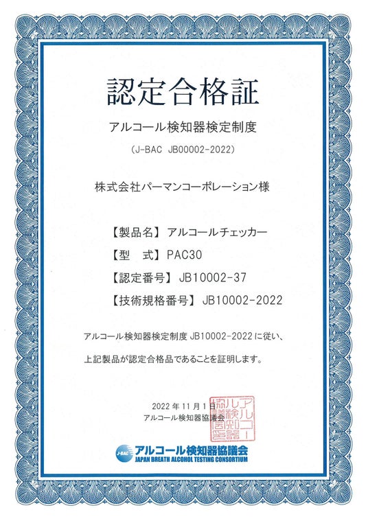 株式会社パーマンコーポレーション(本社:大阪市西区、代表取締役:中部祥元)は、アルコールチェッカー直吹き式がアルコール検知器協議会の検定制度の認定機器として、1年に1回実施される維持審査に合格しました。