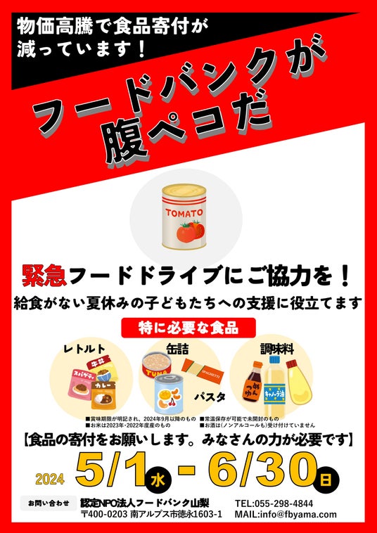 NPO法人フードバンク山梨(所在地:山梨県南アルプス市 理事長:米山けい子)は、子どもの貧困対策の一環として、夏休み中の子どものいる世帯と、高校生のいる世帯に食料支援を行っています。