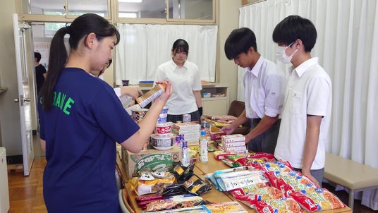 高校でのフードドライブ(スクールフードドライブ)活動の様子。集めた食品を点検している