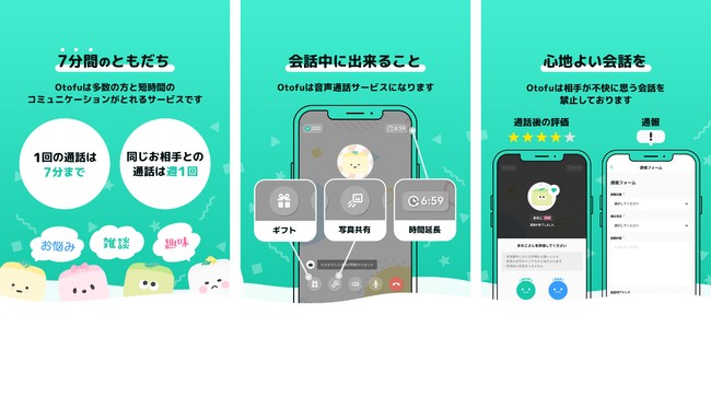 「Otofu」は、“家族や友達でもない誰かと、ただ純粋に話がしたい”という気持ちを埋めるスマートフォン向けの無料音声通話アプリです。ユーザーは、アニメ、ゲーム、スポーツ、ライブなど、趣味が合う人を気軽に指名して1対1限定で音声のみのコミュニケーションを楽しめます。1回の通話は最大7分まで、同じ相手との通話は週に1回までの設定となっているため、初めて話す知らない相手でも7分間という限られた時間であれば切るタイミングを気にすることなく、通話を終了することができます。また、次の予定までのちょっと空いた隙間時間にも気軽に利用できます。