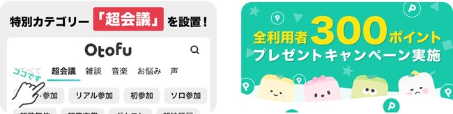 サービス開始に伴い、インターネットの祭典「ニコニコ超会議2022」(開催期間:2022年4月23日~4月30日)との連動企画を実施します。会期中、「Otofu」内に特別カテゴリ「超会議」が出現し、オンライン参加者や現地参加者は超会議の話題でつながることができます。また、リリース記念として全利用者に通話延長やギフトで利用できるポイントを300ポイント分プレゼントします。