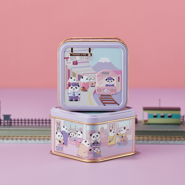 缶の蓋面や側面には駅のホームや、電車を運転中のパンダ、電車を楽しむパンダの乗客が描かれています。