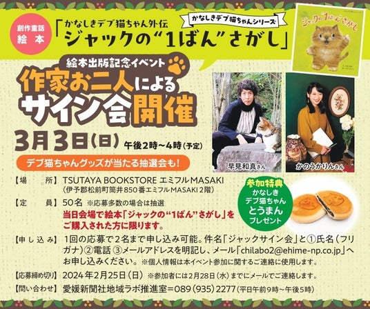 創作童話「かなしきデブ猫ちゃん」シリーズ外伝・絵本「ジャックの“1ばん”さがし」が2月29日(木)発売されることを記念し、3月3日に物語の著者である小説家・早見和真さんと絵本作家・かのうかりんさんによるサイン会を行います。