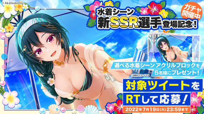 株式会社アカツキゲームス(本社:東京都品川区、代表取締役:戸塚佑貴、株式会社アカツキ100%子会社)は、当社より好評配信中のiOS/Android用アプリ『八月のシンデレラナイン(略称:ハチナイ)』において、7月15日(金)より、5周年記念「Splash Summerキャンペーン」にて水着姿のSSR柊琴葉が新登場することをお知らせいたします。