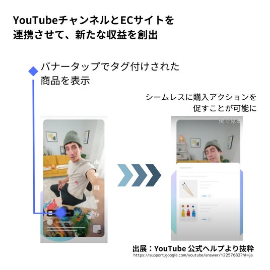 YouTube ShoppingShopifyなどのECサイトをチャンネルにリンクさせることで、YouTube上でのシームレスな購入体験をユーザーに提供可能です。