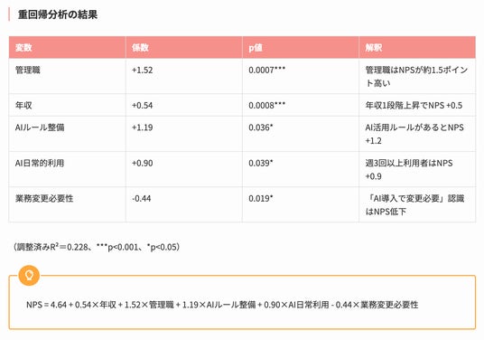 NPS(Net Promoter Score:職場を知人に勧めたいかを0~10点で評価)を従属変数とした重回帰分析を実施した結果、AI活用ルールの整備が従業員満足度に与える影響は年収アップの約2.2倍であることが判明しました。