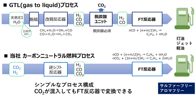 従来のFT合成の多く(GTLプロセス)はメタンを主成分とする天然ガスを水蒸気と共に改質した合成ガスを原料としていましたが、CO2が反応系内に入ると合成ガスの分圧低下が起こるなどの課題があり、FT反応前段にCO2を除去するための脱炭酸ユニットが設けられていました。