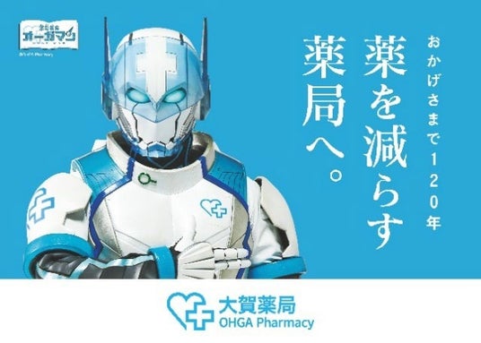 【薬剤戦師オーガマンについて】 大賀薬局の社長が変身するコーポレートヒーロー。1000億円とも言われる残薬問題に立ち向かい、「薬を増やす」のではなく「薬を減らす」ことを使命に掲げ、地域活動や保育園・幼稚園・学校訪問を通じて薬育啓発を行っています。決め台詞は「薬飲んで、寝ろ。」 ドゲンジャーズの一員としても活躍中です。