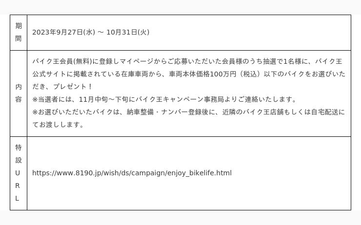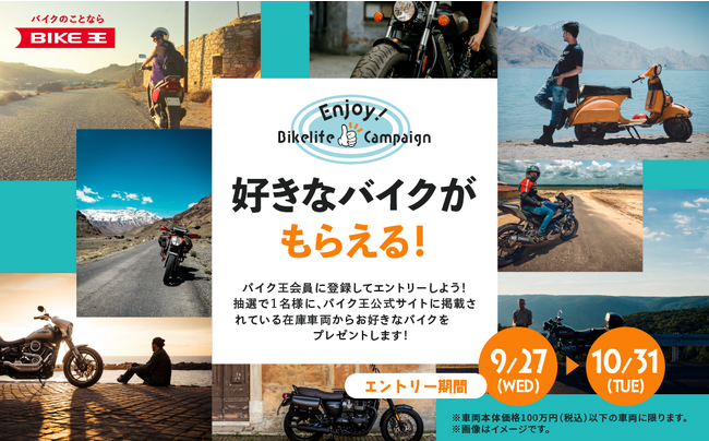 昨年の応募総数1万件超えの大好評のバイクプレゼント企画「Enjoy!バイクライフキャンペーン」を今年も実施いたします!当キャンペーンでは、既にバイク王会員の方はもちろん、期間中にバイク王会員(無料)に登録いただいた方も対象で、マイページからご応募いただいた方の中から抽選で1名様に、バイク王公式サイトに掲載されている在庫車両の中から、車両本体価格100万円(税込)以下のお好きなバイクをプレゼントいたします。バイク王会員(無料)と応募は、専用WEBサイトより簡単に登録いただけます。あなたの新たなバイクライフを応援する「Enjoy!バイクライフキャンペーン」にぜひご応募ください。