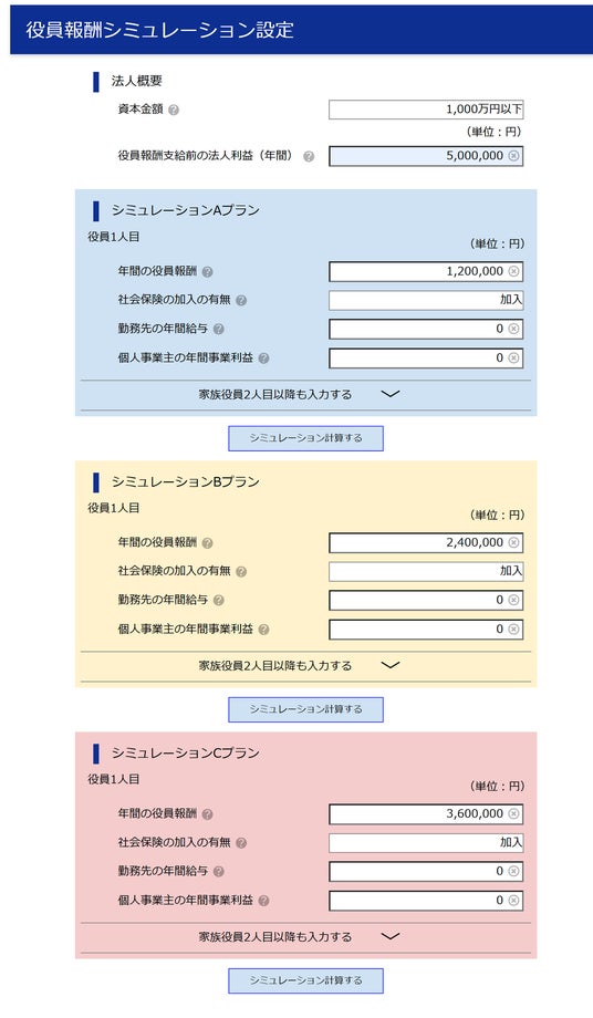 役員報酬をシュミレーションする際は、法人概要を入力し、続いて年間の役員報酬や社会保険などの情報を入力します。