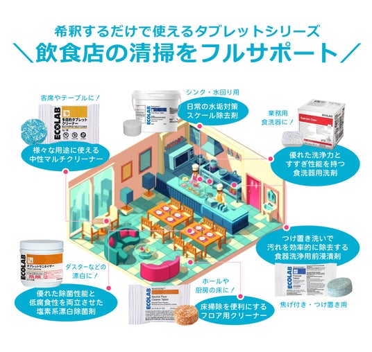 液体洗剤の代わりにタブレットを水やお湯に溶かすだけで使用できる本製品は、保管・計量・詰め替えの手間を省き、飲食店のオペレーション効率を大幅に改善します。