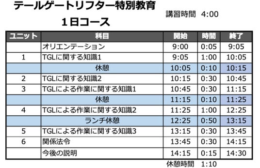 貨物自動車に設置されたテールゲートリフター操作の業務を行う方を対象に、必要な知識と実務能力を習得していただくため、学科4時間のカリキュラムによる講習です。