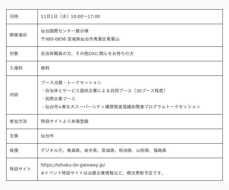 イベントでは、東北内外の自治体・企業のブース出展や東北の先進自治体によるDXの取り組み事例の紹介や民間企業によるソリューションの紹介等を通じ、同じ課題を持つ自治体職員に学びの機会を提供するとともに、民間企業には横展開によるビジネス拡大の機会を提供いたします。