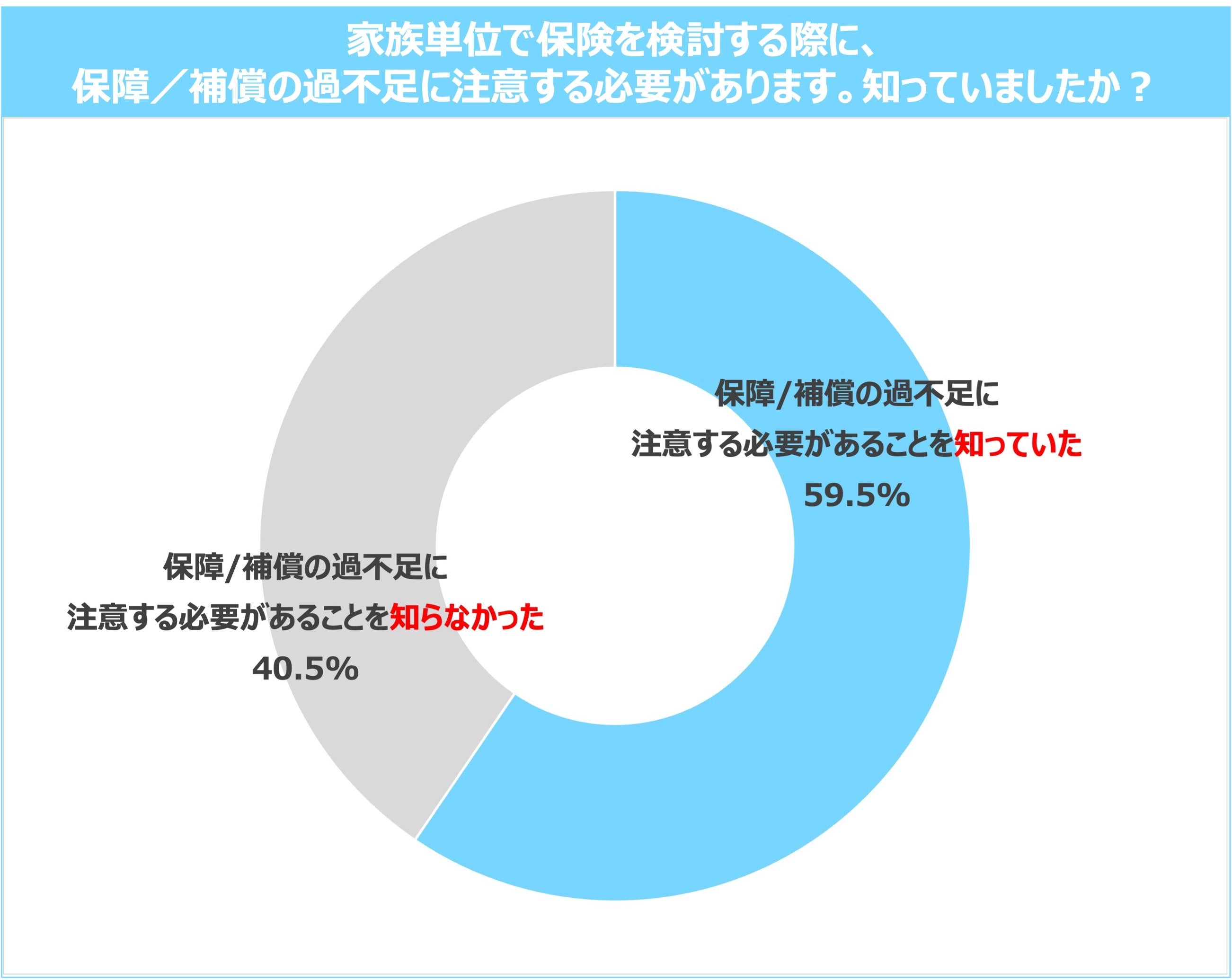 また、家族単位で保険を検討する際、保障/補償の過不足(例:夫婦で二重加入している、または必要な保障/補償がどちらも未加入など)に注意が必要だと知っている人は約6割近くいることがわかりました。しかし、実際に自分とパートナーの保険内容を確認したことがある人は、半数以下(44.4%)にとどまっています。この結果から、半数以上の人が家族単位での過不足の注意、見直し検討の重要性は知っているにも関わらず、確認せず後回しにしている、という行動ギャップを抱えていることがわかります。