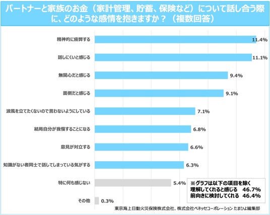 家族のお金(家計管理、貯蓄、保険など)について、パートナーと話し合いができているか質問したところ、「話し合いができている」(74.6%)と、話し合いができている人が約7割と比較的多いという結果になった一方で、「話し合いができていない」(25.4%)と、約4人に1人がお金のコミュニケーション不足であることも判明しました。また、パートナーとお金(家計管理、貯蓄、保険など)について話し合う際に、どのような感情を抱くか質問(複数回答)したところ、「理解してくれると感じる」「前向きに検討してくれる」との回答が大半を占める一方で、「精神的に疲弊する」(11.4%)や、「話しにくいと感じる」(11.1%)などの項目への回答も見られ、夫婦であってもお金について話し合う際、感情的な負担があるようです。