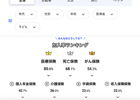 年代や性別、家族構成や年収が近い人がどんな保険に加入しているかを参考にできます。どのような内容の保険に加入する人が多いのかを知ることで、「何から手をつけてよいか分からない」「何を重視すればよいか分からない」という不安をプロに直接相談することなく解消することができます。情報収集の手間が省け、夫婦のお金・保険に関する会話をスムーズにするきっかけを提供します。