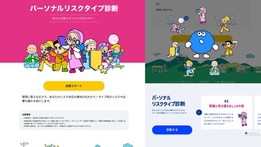 「パーソナルリスクタイプ診断」行動経済学に基づき、31問の設問に直感的に答えることで、ユーザーを7つのリスク性向タイプに分類します。リスクに翻弄されやすい人、準備に余念がない人など、今までにない観点の性格診断としても楽しめ、普段避けがちな保険の話をするきっかけにもなります。