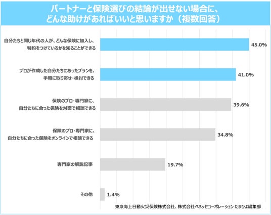 また、「なぜか自分ばかりがやっている」「正直、負担に感じる」ことの中に、「税金や社会保険に関する情報収集」 (17.4%)、「保険の検討や、保険の管理全般」(13.4%)と保険に関しての負担も多いことがわかりました。そんな中、パートナーと保険選びの結論が出せない場合に、どんな助けがあれば良いかの質問(複数回答)では、「自分たちと同じ年代の人が、どんな保険に加入し、特約をつけているかを知ることができる」が約半数 (45.0%)、「プロが作成した自分たちにあったプランを、手軽に取り寄せ・検討できる」(41.0%)と、具体的な情報収集や、手軽さを求める声が多数を占めました。