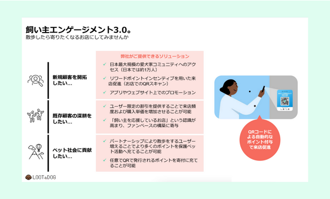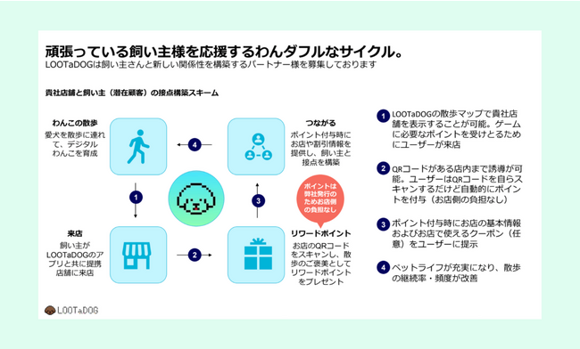 また、これらを実現するためには、散歩を楽しむペットと飼い主が少しでも増える必要があると考え、LOOTaDOGのゲームにリアル世界でのゲーミフィケーション要素とリアル店舗の支援サービスを付与したLOOTaDOG QRを導入する運びとなりました。