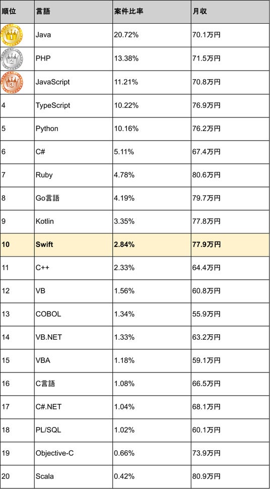 これらのデータからSwiftは高単価かつリモートワーク対応率が高い案件を狙うフリーランスエンジニアにとって投資対効果の高い選択肢であり、AppleエコシステムでUI/UXとセキュリティを両立したサービス開発に挑戦したい方に最適と言えるでしょう。