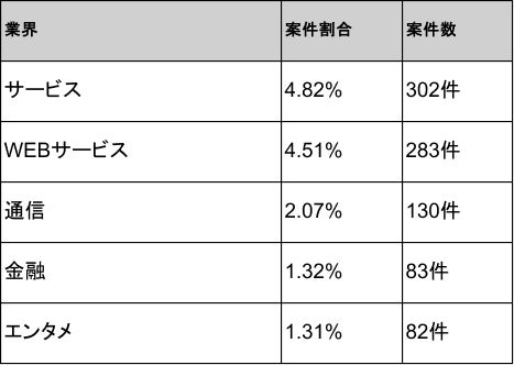 Swift案件はサービス業界が4.82%(302件)、WEBサービスが4.51%(283件)と僅差で続き、通信が2.07%(130件)で3位です。金融1.32%(83件)、エンタメ1.31%(82件)を含む上位5業界で全体の約14.0%を占めています。