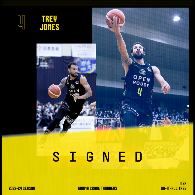 この度、群馬クレインサンダーズでは、#4 トレイ・ジョーンズ選手とのBリーグ2023-24シーズンの選手契約(継続)が基本合意に達しましたのでお知らせいたします。