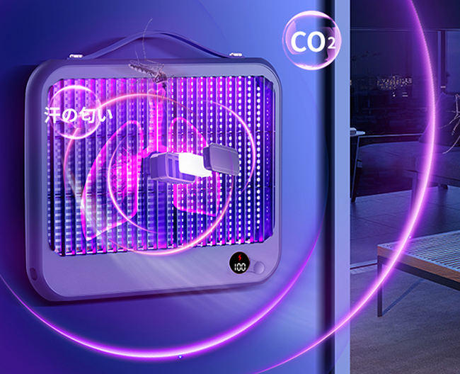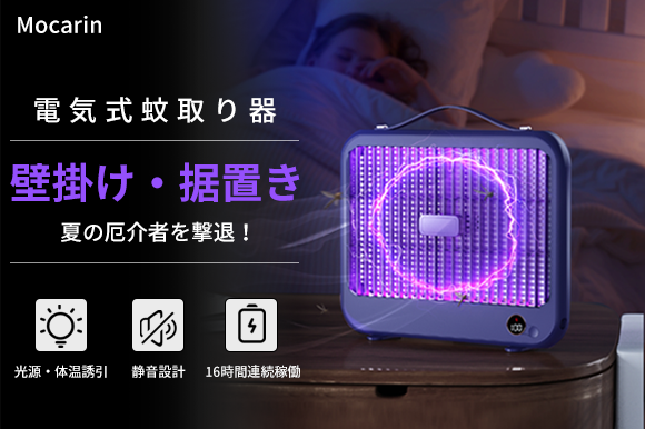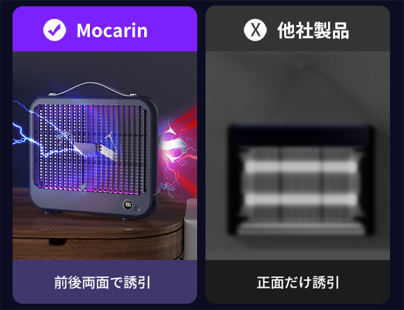 Mocarinは蚊の習性に基づいて設計されております。紫外線を放出し、生物の体温を感じさせる「温度」、生物の呼気を模倣する「二酸化炭素」を併用して蚊やその他の小さな虫を引き寄せ、2000V高電圧で瞬時に駆除します。