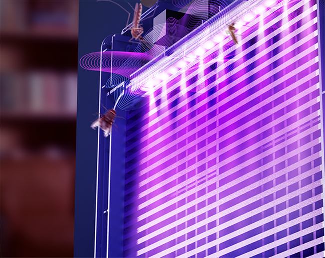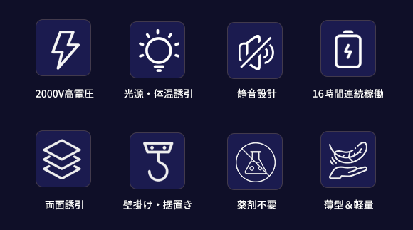 2. 薬剤不要。UV光源や温度、二酸化炭素で誘引、有害な化学物質が発生しません。