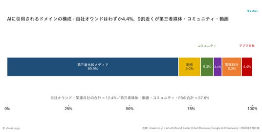 自社オウンドの構成比はわずか4.4%で、第三者比較メディア(69.9%)・動画(9.0%)・コミュニティ(5.3%)・PR(3.4%)の合計が87.6%を占める結果となりました。