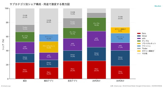 各サブカテゴリでのシェア構成を見ると、Pairsは総合23.0%・恋活25.4%・20代25.5%とほぼ4分の1を占める一方、30代では18.3%まで低下します。