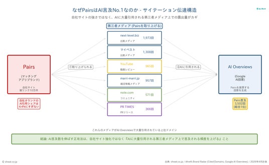 結果は明確で、引用元のうちマッチングアプリブランドの自社オウンドはタップル(11位)の1ドメインのみ。残りはnext-level.biz(1,973回、1位)、マイベスト(1,308回、2位)、YouTube(965回、3位)、note、PR TIMESなど、第三者プラットフォームが圧倒的多数を占めました。