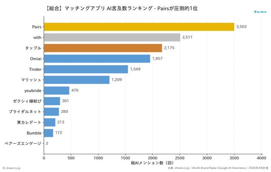 - 総合ランキングではPairsがAI言及3,502回で圧倒的1位、2位withの1.4倍