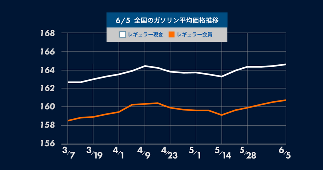 6月5日(月) 時点のレギュラーガソリンの全国平均は、164.6円となり先週から0.4円の値上がり。3週連続の値上がりとなりました。