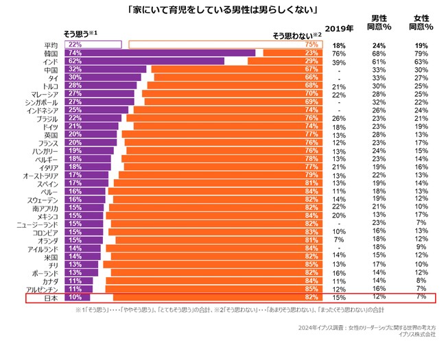 世界最大規模の世論調査会社イプソス株式会社(日本オフィス所在地:東京都港区、代表取締役:内田俊一)は、日本を含む世界31カ国24,269人を対象に、女性のリーダーシップに関する世界の考え方について調査を実施しました。その結果、「家にいて育児をしている男性は男らしくない」という考え方に対し、「そう思う」と回答した日本人は、調査対象国31カ国中最も少ない10%で、2019年の調査から5年間で5ポイント減少していることがわかりました。