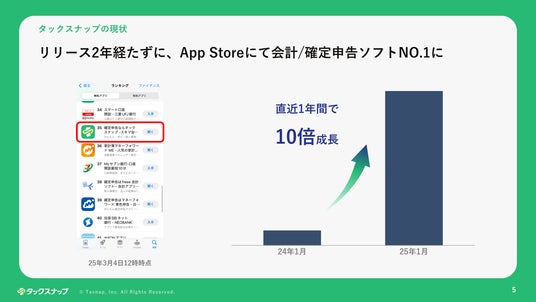 昨年度の確定申告では確定申告アプリNO.1になり、直近1年間では登録会員数が10倍に成長しております。