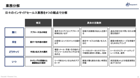 株式会社EmpowerXは「世の中をEmpowermentする」をミッションに掲げ、クライアントの事業成長に営業支援で伴走する営業支援企業です。営業現場で培われた専門性と事業全体を俯瞰し成功へ導く戦略構築力を強みに、売上に直結する質の高い商談機会を創出・拡大しています。戦略策定から現場での実行までをハンズオンで支援し、クライアント企業の事業成長を実現しています。