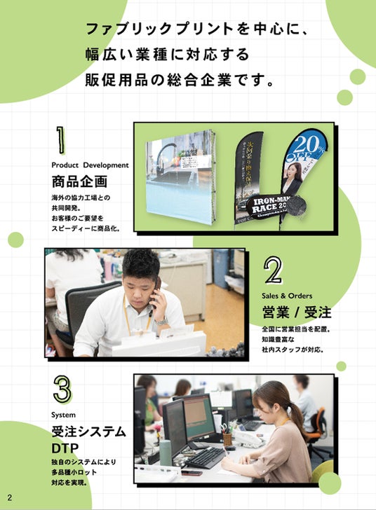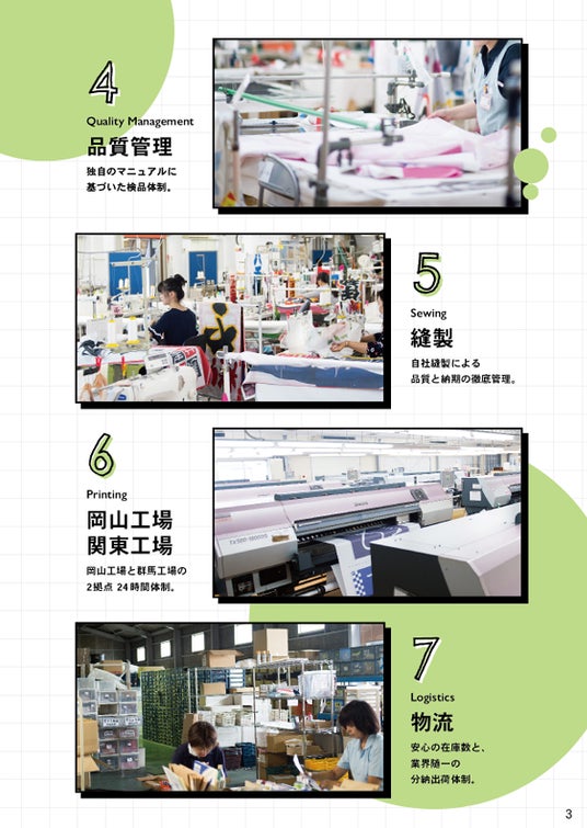 本カタログでは、のぼりやバナー、ポールなど、様々な販促ツールを取り揃えています。また、商品企画から受注、品質管理、縫製、印刷、物流まで、全ての工程を網羅し、当社の高品質な製品を迅速に提供する体制を詳しく紹介しています。