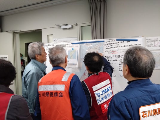 松本吉郎会長は1月12日、令和6年能登半島地震発生後初めて被災地を訪問。安田健二石川県医師会長らと石川県庁を訪れ、馳浩石川県知事と会談を行うとともに、県庁内に設けられたJMAT調整本部や公立能登総合病院内のJMAT七尾調整支部を視察しました。