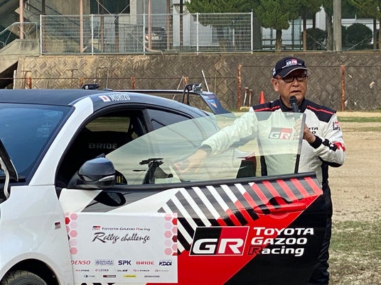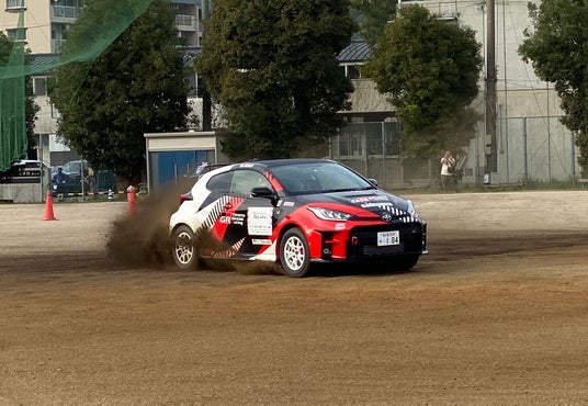豊田章男氏がラリーカーの「GRヤリス」にモリゾウ(豊田章男氏のドライバーネーム)として乗車。生徒を助手席に乗せ、里山校のグラウンドでドーナツターンなど大迫力のデモランを披露しました。