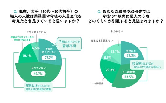 ・7割以上(74.3%)が「若手職人が不足している」と回答。また、約6割(56.8%)が「10年以内に3割以上が引退する見込み」と回答。