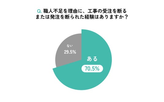 「職人不足を理由に、工事の受注を断る、または発注を断られた経験があるか」との問いに対し、7割以上(70.5%)が「ある」と回答しました。