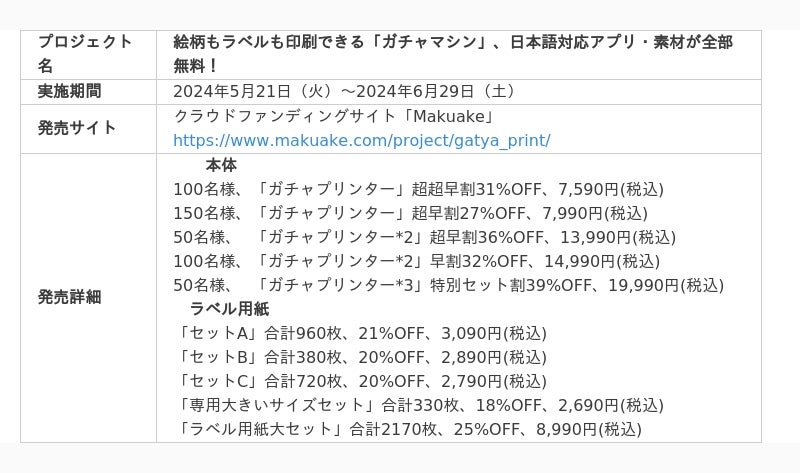 絵柄もラベルも印刷できる「ガチャマシン」!日本語対応アプリ・素材が全部無料【「ガチャ」プリンター】がMakuakeにてクラウドファンディングを開始いたしました。募集は2024年5月21日(火)からスタートします。