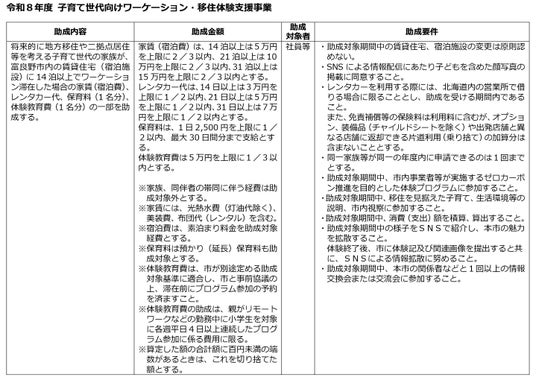 将来的に地方移住や二地域居住を考える子育て世代のご家族が、富良野市内の宿泊施設等に2週間以上滞在した際に、宿泊費、レンタカー代、保育料などの一部を助成。