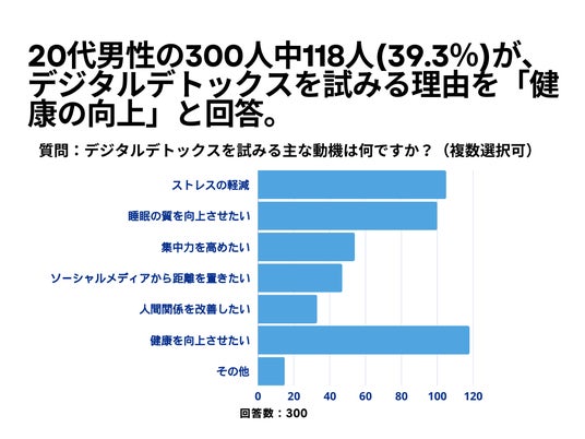 20代男性の300人を対象とした「デジタルデトックスを試みる主な動機は何ですか?」というアンケートで118人(39.3%)が「健康の向上」という結果になりました。