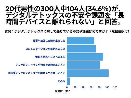 20代男性の300人を対象とした「デジタルデトックスに対して感じている不安や課題は何ですか?」というアンケートで104人(34.6%)が「長時間デジタルデバイスと離れることが難しい」という結果になりました。